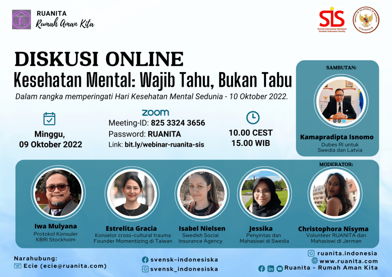 Rumah Aman Kita (RUANITA) selaku komunitas Indonesia di luar Indonesia yang aktif mempromosikan isu kesehatan mental bekerja sama dengan Swedish Indonesian Society (SIS) menggelar diskusi virtual bertema kesehatan mental untuk memperingati Hari Kesehatan Mental Sedunia 2022 yang jatuh pada tanggal 10 Oktober setiap tahunnya.