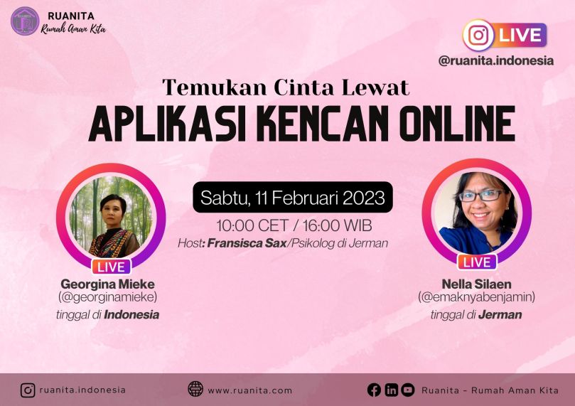 Bagaimana pengalaman dan tantangan yang dialami para pengguna aplikasi kencan online? Diskusi IG Live RUANITA di episode Februari 2023 ini membahas tema ‘Temukan Cinta di Aplikasi Kencan Online’ yang dipandu oleh Fransisca Sax (@psychatte_), seorang psikolog yang tinggal di Jerman. RUANITA juga turut mengundang tamu spesial yakni Georgina Mieke (@georginamieke) yang tinggal di Indonesia dan Nella Silaen (@emaknyabenjamin) yang tinggal di Jerman. Mereka berbagi pengalaman saat membangun kehidupan baru dengan pasangan yang ditemui di aplikasi kencan online, dan bagaimana menghadapi kondisi belum berhasil meski sudah mencoba bertahun-tahun lamanya.