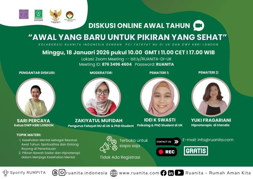 London, 18 Januari 2026 — Acara diskusi daring bertajuk “Awal yang Baru untuk Pikiran yang Sehat” yang mengangkat tema promosi kesehatan mental bagi masyarakat Indonesia di Inggris Raya telah berlangsung pada Minggu malam waktu Indonesia, dan berhasil menarik partisipasi masyarakat Indonesia dari berbagai kota di Inggris Raya serta beberapa negara di sekitarnya. Kegiatan yang diprakarsai oleh komunitas Ruanita dan didukung oleh KBRI London itu digelar melalui platform Zoom Meeting selama dua jam, sejak pukul 10.00 hingga 12.00 waktu Inggris atau pukul 17.00 hingga 19.00 WIB.