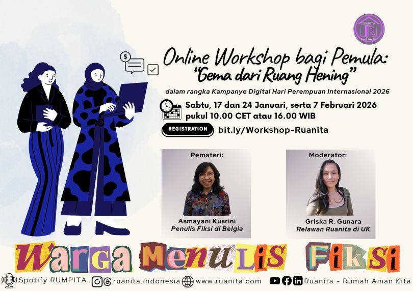 Jakarta, Januari 2026 – Ruanita Indonesia kembali menyelenggarakan program literasi bertajuk Workshop Warga Menulis Fiksi “Gema dari Ruang Hening”, sebuah ruang menulis kolektif untuk orang Indonesia di berbagai negara dalam mengolah pengalaman hidup menjadi karya fiksi yang kuat, bermakna, dan berlapis konteks transnasional. Program ini digelar sebagai bagian dari Kampanye Digital peringatan Hari Perempuan Internasional 2026 dan menjadi salah satu agenda literasi tahunan Ruanita.