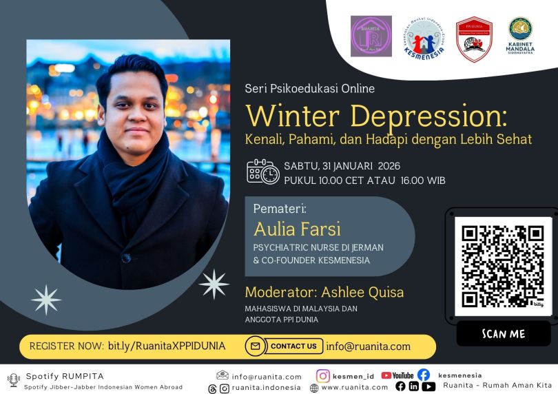 Menyadari hal ini, Ruanita menggandeng Kesmenesia berkolaborasi dengan PPI Dunia untuk menyelenggarakan psikoedukasi daring bertajuk “Winter Depression: Kenali, Pahami, dan Hadapi dengan Lebih Sehat”. Acara ini dijadwalkan pada Sabtu, 31 Januari 2026, pukul 10.00 CET atau 16.00 WIB, melalui Zoom Meeting, dan terbuka untuk pelajar Indonesia baik di luar negeri maupun di dalam negeri, serta pengurus dan anggota PPI.