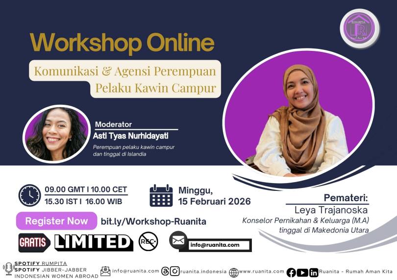 Skopje, 15 Februari – Berbicara soal kawin campur, yang sering muncul adalah kisah cinta lintas negara, budaya, dan bahasa. Namun jarang yang mengangkat pertanyaan yang lebih dalam: bagaimana perempuan menegosiasikan suara, kuasa, dan ruang komunikasinya dalam keluarga lintas budaya? Pertanyaan inilah yang menjadi titik temu workshop online yang diselenggarakan Ruanita pada Minggu, 15 Februari 2026.