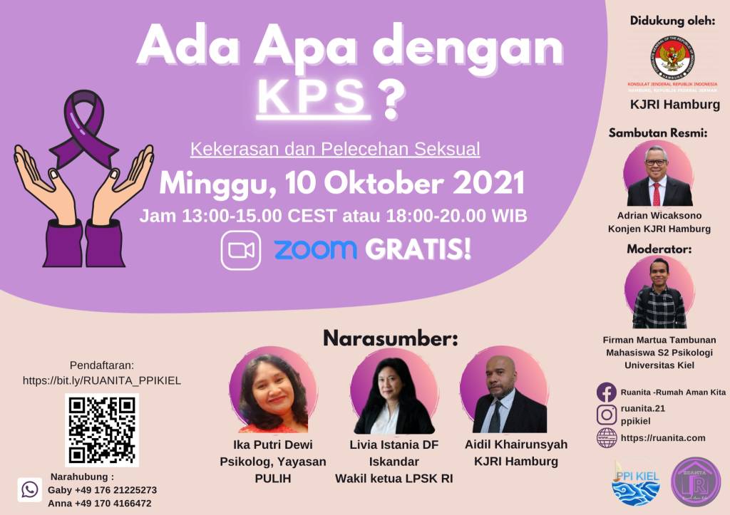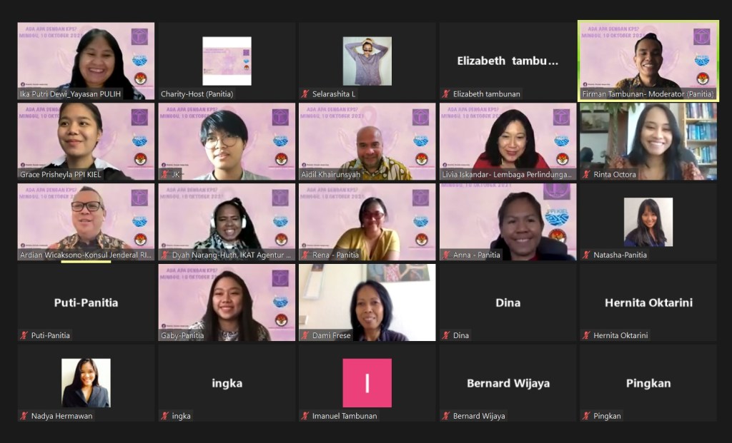 JERMAN – PPI Kiel bekerja sama dengan RUANITA – Rumah Aman Kita menggelar acara webinar bertema Kekerasan dan Pelecehan Seksual (KPS) yang diadakan secara daring pada Minggu, 10 Oktober 2021 dan diikuti oleh puluhan Warga Negara Indonesia (WNI) dari Jerman, Belanda, Swiss, Spanyol, Swedia dan tentunya dari Indonesia.