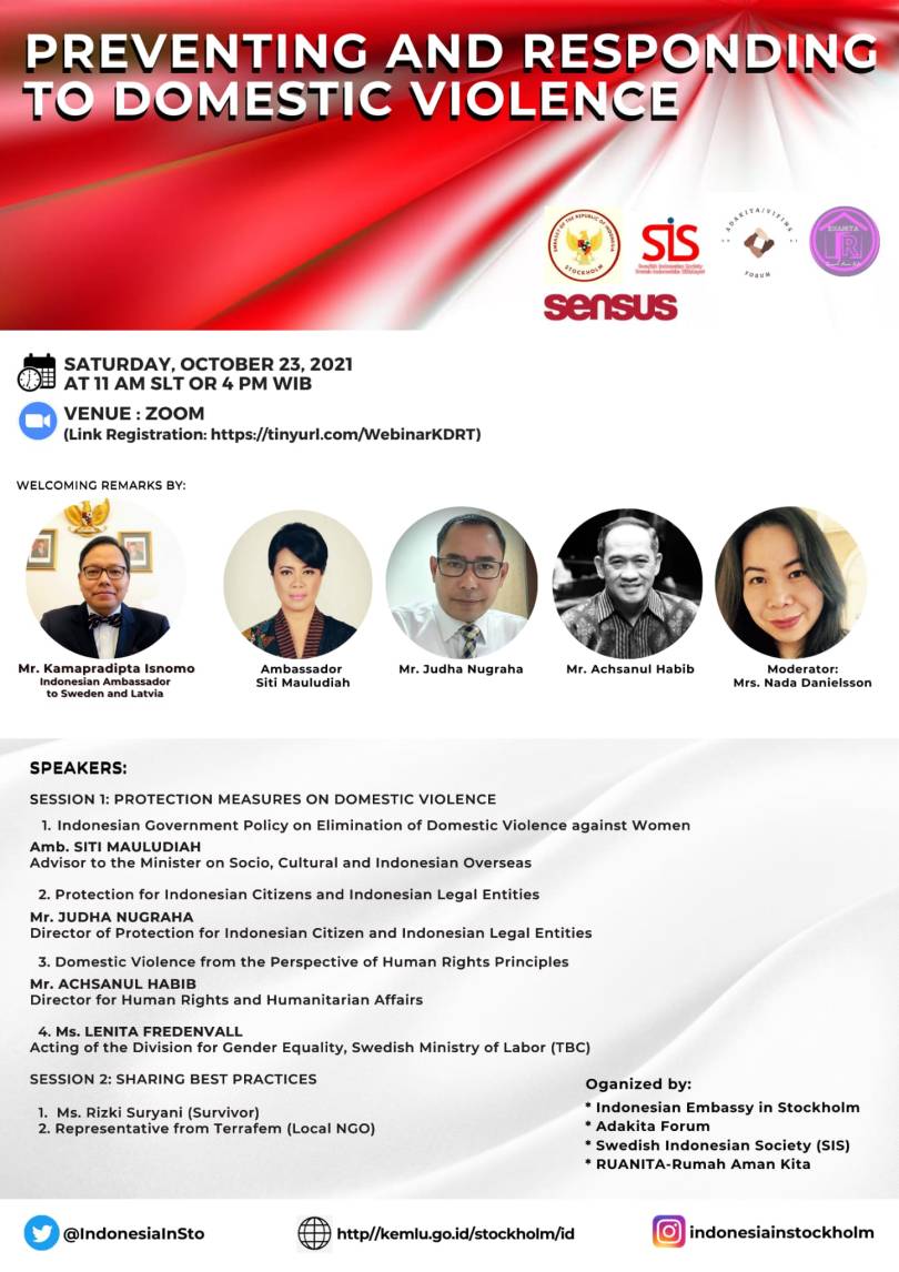 SWEDIA – KBRI Stockholm bekerja sama dengan Swedish Indonesian Society (SIS), Adakita Forum dan RUANITA menggelar webinar bertema: Kekerasan Dalam Rumah Tangga (KDRT) pada Sabtu (23/10) yang digelar secara virtual. Acara ini dibuka resmi oleh Dubes RI untuk Kerajaan Swedia merangkap Republik Latvia, Kamapradipta Isnomo.