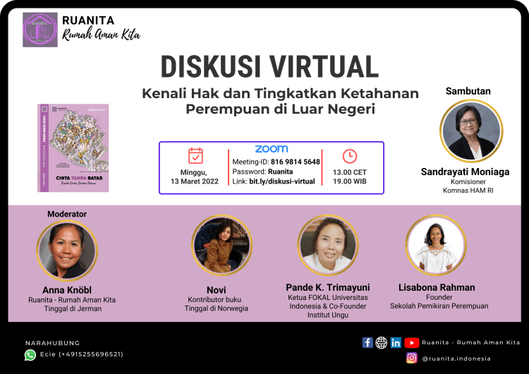 Sejalan dengan hal tersebut, RUANITA menggelar peluncuran buku secara daring yang diadakan pada hari Minggu, 19 Juni 2022 jam 10.00 waktu Eropa Tengah atau jam 15.00 WIB.