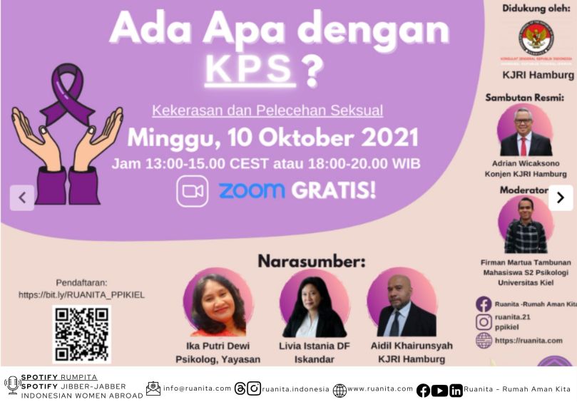JERMAN – PPI Kiel bekerja sama dengan RUANITA – Rumah Aman Kita menggelar acara diskusi online bertema Kekerasan dan Pelecehan Seksual (KPS) yang diadakan secara daring pada Minggu, 10 Oktober 2021 dan diikuti oleh puluhan Warga Negara Indonesia (WNI) dari Jerman, Belanda, Swiss, Spanyol, Swedia dan tentunya dari Indonesia.