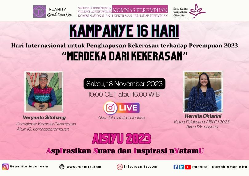 Dalam diskusi IG Live episode November 2023, Ruanita Indonesia mengangkat tema Hari Internasional Penghapusan Kekerasan terhadap Peremuan yang masih menjadi rangkaian program AISIYU (=AspIrasikan Suara dan Inspirasi nYatamU) 2023. Program AISIYU 2023 diselenggarakan dalam bentuk kolase dengan judul “Merdeka dari Tindak Kekerasan” dimulai dari 25 November hingga 10 Desember, yang menjadi Hari Hak Asasi Manusia Sedunia.