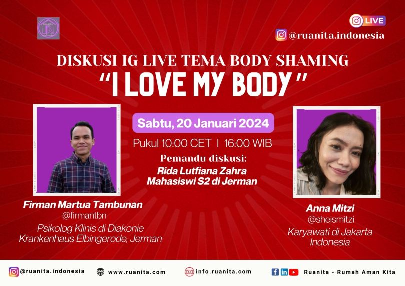 Sebagaimana program rutin tiap bulan, diskusi IG Live pada bulan Januari 2024 kali ini membahas tema Body Shaming, yang dipandu oleh Rida Lutfiana Zahra, Mahasiswi S2 di Jerman. Selanjutnya Ruanita Indonesia mengundang narasumber yakni: Firman Martua Tambunan, Psikolog Klinis di Jerman dan Anna Mitzi yang bekerja di Jakarta, Indonesia.