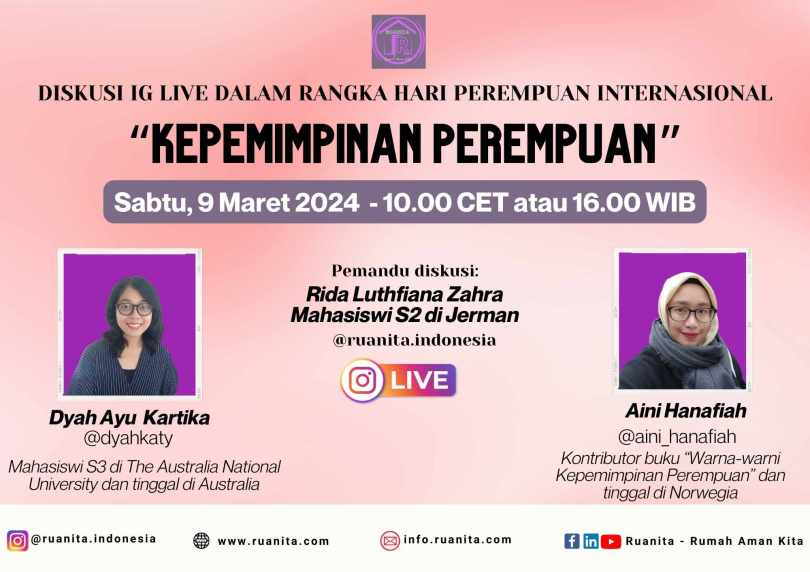 Untuk membahas lebih dalam tentang kepemimpinan perempuan, kami mengundang Dyah Kartika Ayu, seorang mahasiswi S3 di The University Australian National University, Monash University, dan tinggal di Australia dan juga Aini Hanafiah, seorang kontributor buku “Warna-warni Kepemimpinan Perempuan” yang tinggal di Norwegia.