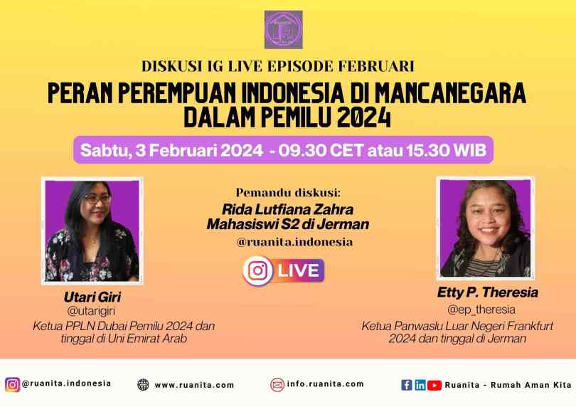 Untuk membahas lebih dalam tentang proses pemilihan umum yang berlangsung di luar negeri dan bagaimana perempuan Indonesia dapat tetap terlibat dalam pemilihan umum, meski di luar negeri, Ruanita Indonesia mengundang narasumber.
