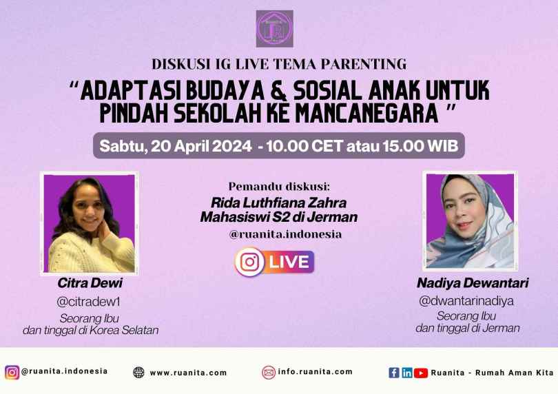 Dalam diskusi IG Live yang diselenggarakan pada bulan April 2024, Ruanita Indonesia mengambil tema parenting, yang khususnya tentang bagaimana adaptasi sosial dan budaya pada anak apabila anak berpindah sekolah ke luar negeri.