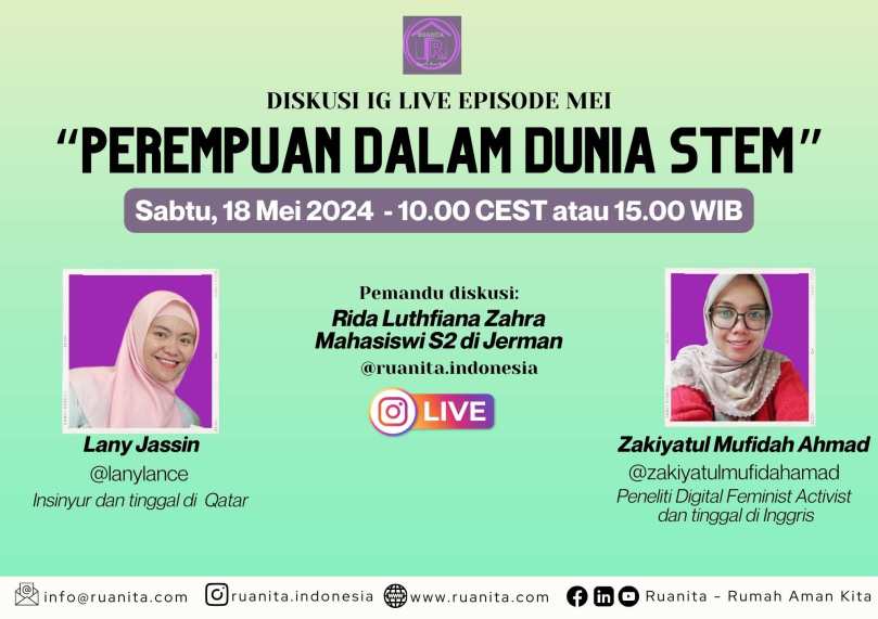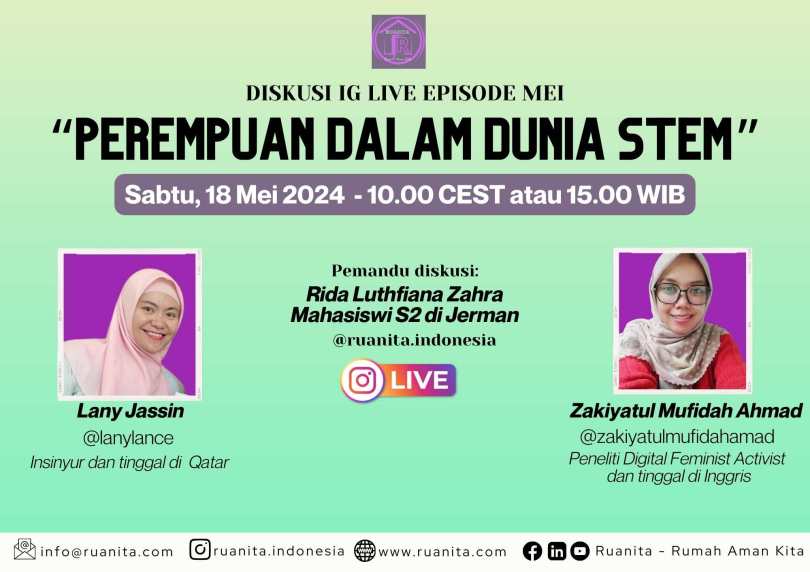 Ruanita – Rumah Aman Kita – Indonesia memiliki program diskusi IG Live yang dilaksanakan tiap bulan dengan tema-tema menarik. Di bulan Mei 2024, Ruanita Indonesia mengangkat tema perempuan dalam dunia STEM (Science, Technology, Engineering and Mathematics), terutama melihat peluang karier dan kewirausahaan untuk perempuan Indonesia.