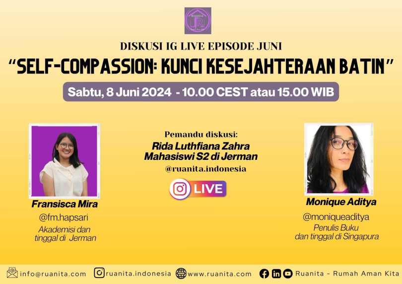 Dalam diskusi IG Live Ruanita Indonesia di bulan Juni mengangkat tema self-compassion bersama dua narasumber yang kompeten di bidangnya.
