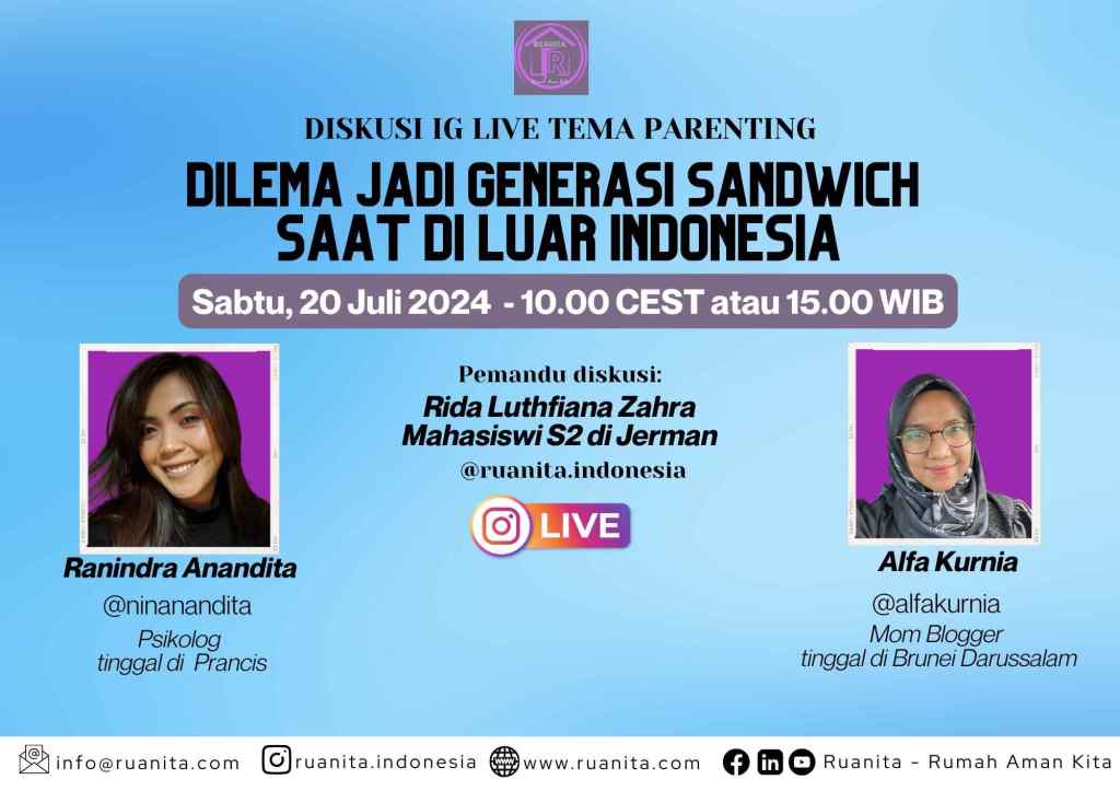 Dalam diskusi IG Live episode Juli 2024 mengangkat tema generasi sandwich, yang mungkin banyak relate dengan sahabat Ruanita yang tinggal di luar Indonesia dan sedang berada dalam posisi ini.