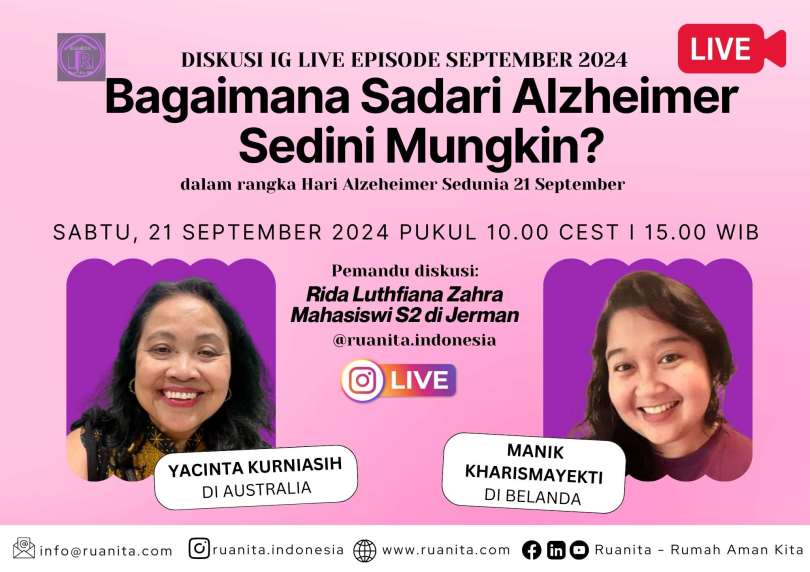 Dalam rangka memperingati Hari Alzheimer Sedunia yang diperingati tiap 21 September, Ruanita Indonesia mengundang dua sahabat Ruanita yang tinggal di Belanda dan di Australia.
