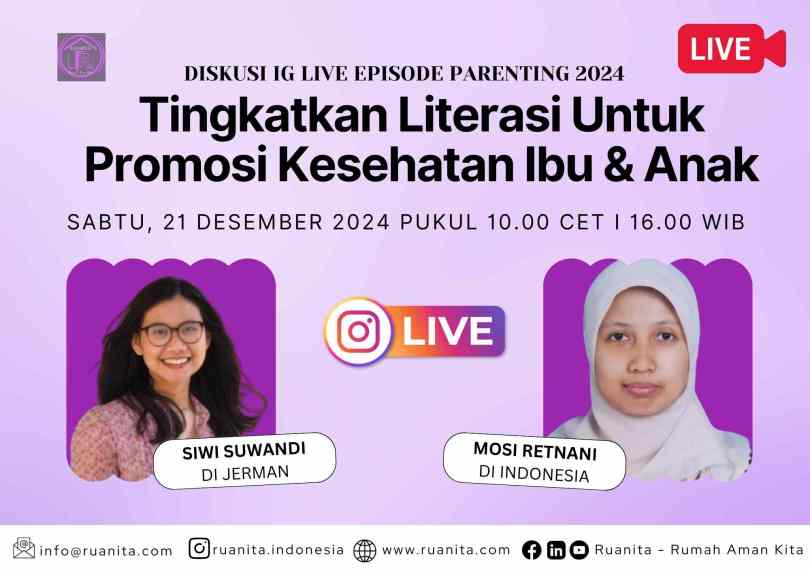 Diskusi IG LIVE episode Desember 2024 mengundang sahabat Ruanita yang tinggal di Jerman dan di Indonesia untuk berbagi pengalaman dan pengetahuan seputar kelahiran bayi prematur yang mereka hadapi. Bagaimana mereka bertukar cerita dan informasi, sehingga memperkaya diskusi IG LIVE kali ini tentang pentingnya literasi kesehatan ibu dan anak, agar ibu dan anak sama-sama sehat.