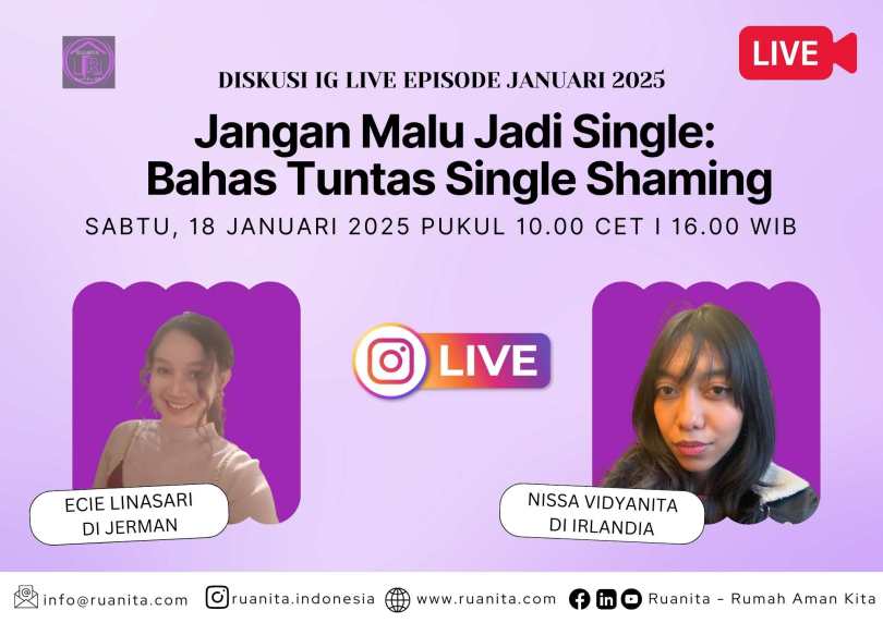 Melanjutkan diskusi IG Live yang tayang setiap bulan, pada bulan Januari 2025 Ruanita – Rumah Aman Kita – Indonesia menggelar diskusi yang tak kalah seru untuk membahas status single, bersama dua sahabat Ruanita yang berada di dua lokasi negara berbeda.