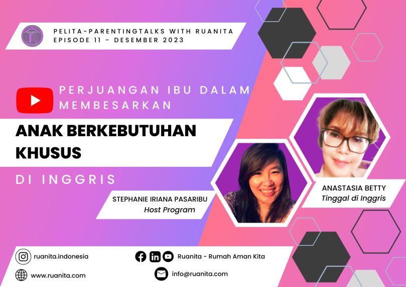 Dalam episode 11 Parentingtalks with Ruanita atau PELITA, Stephanie Iriana Pasaribu mengundang sahabat Ruanita yang kini menetap di Inggris untuk berdiskusi tentang merawat dan membesarkan anak dengan berkebutuhan khusus.