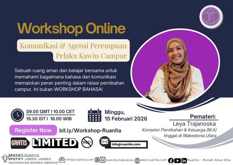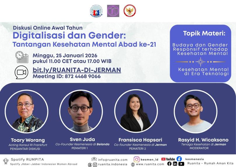 Dalam rangka memperingati 16 Hari Anti Kekerasan terhadap Perempuan, Ruanita Indonesia bekerja sama dengan Kesmenesia, organisasi profesi tenaga kesehatan mental orang Indonesia di Eropa, mengadakan sesi IG LIVE bertema “Pengalaman Pendampingan Perempuan Penyintas Kekerasan di Luar Negeri.” Acara ini disiarkan…